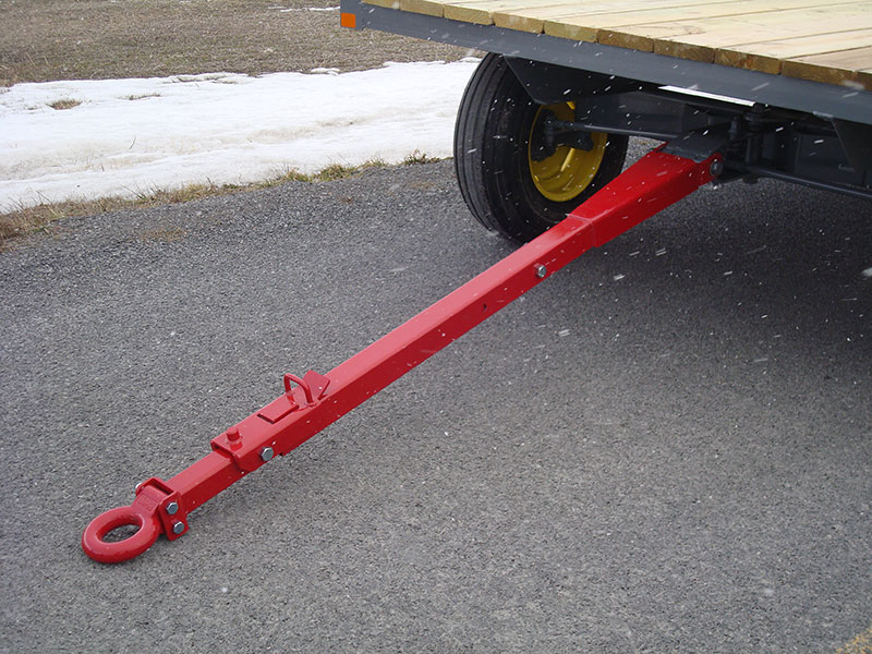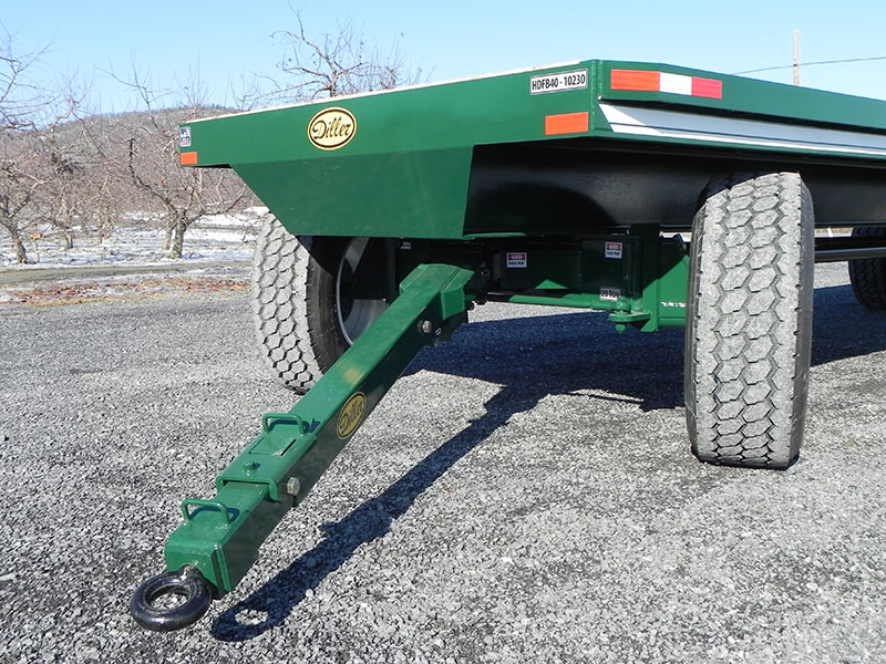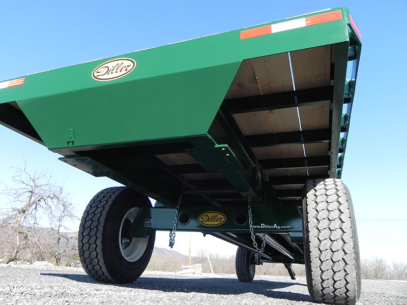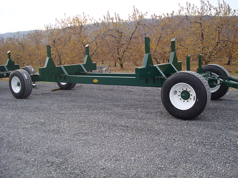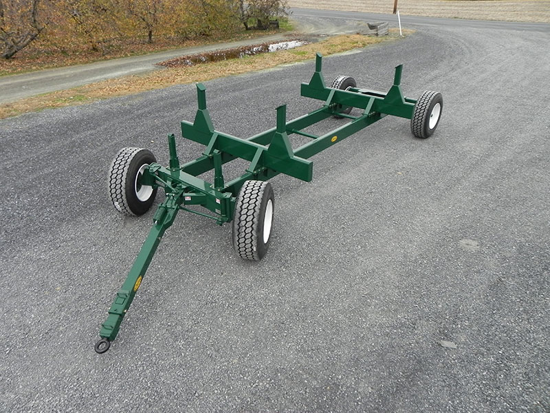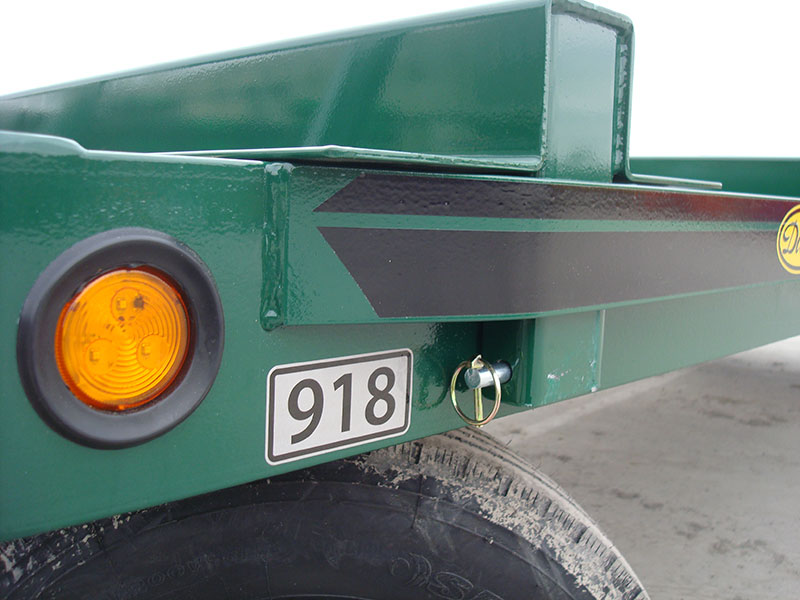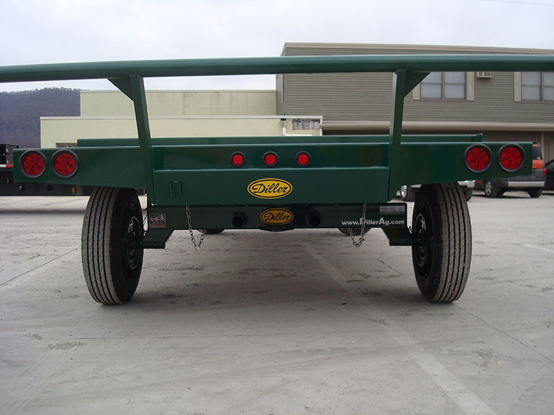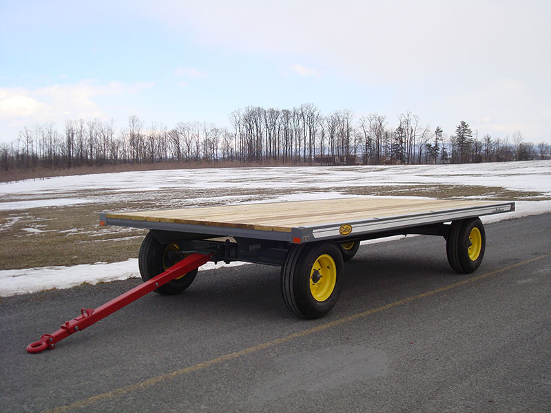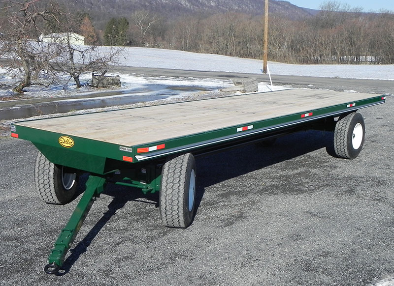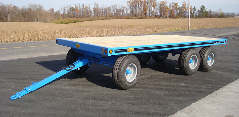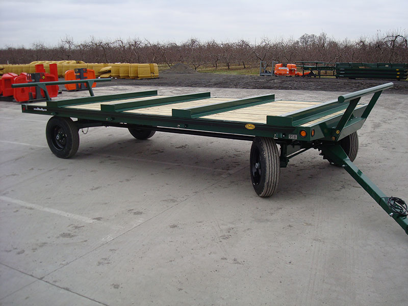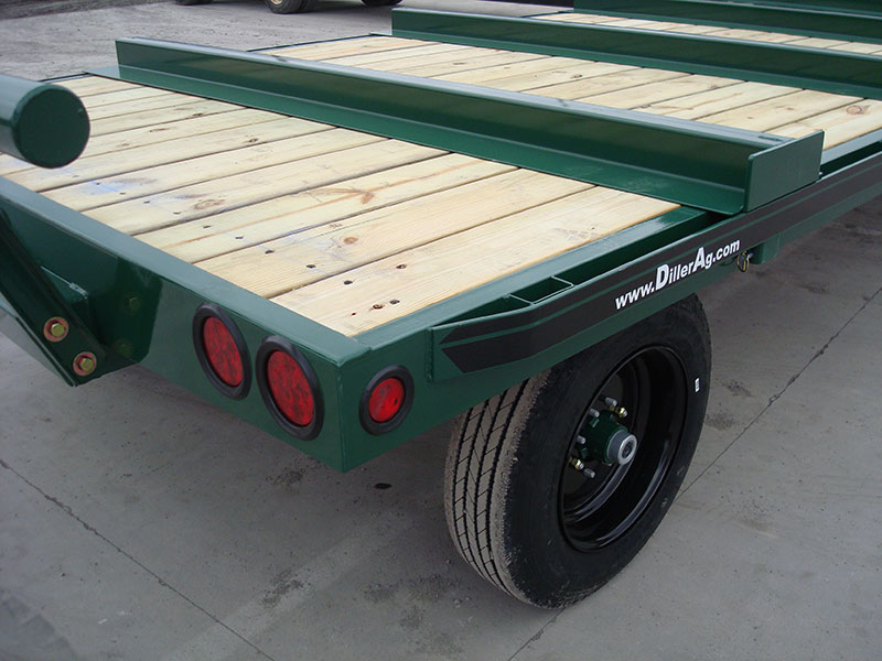This particular customer was looking for a multi-use flatbed that could be quickly & easily be converted from a bin transport wagon to a plain flatbed. A heavy duty flatbed with stake pocket rubrail makes up the main deck. Front and rear bulkheads limit cargo from sliding off the bed when stopping and starting. A series of removable dividers were built to slip into the stake pocket rubrail and plastic produce bins would slide between the dividers. The flatbed features recessed LED lighting for road travel, towed behind a pickup truck or a tractor. The chassis was a 10 Ton running gear with 9" electric brakes and DOT legal radial street tires.