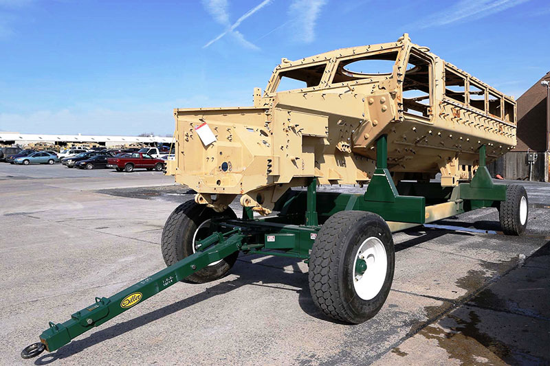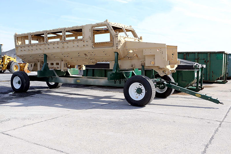 This custom build was designed specifically to transport and shot blast the stripped hulls of RG-33 MRAP's. The foundation of this unit was a wagon style chassis with a 30,000lb capacity and a safety factor of 2x. Super single truck tires were mounted on 15,000lb hubs with shielded grease seals and bearings to reduce the wear associated from repeated sand and shot blasting exposure. The frame was designed with attachment points for modular support brackets that held the units in place.