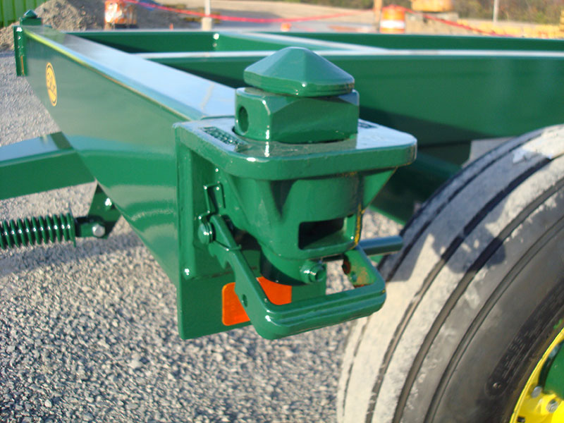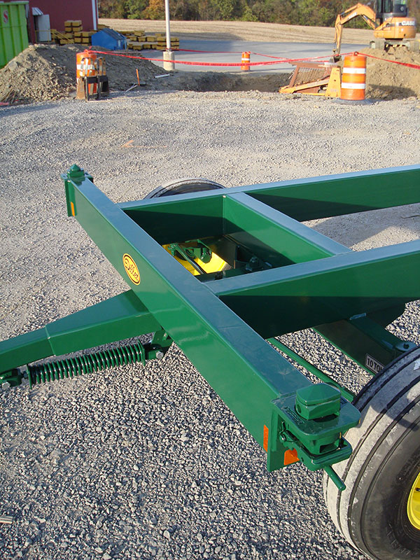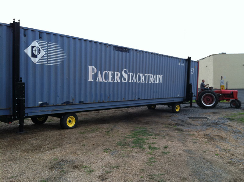 This particular customer was looking for a trailer or wagon to move shipping containers around at a maintenance terminal. The small tugger they were using to move the containers didn't have tongue weight capacity that would allow a traditional trailer, so they selected a wagon style chassis with front and rear axles. The frame was 40' long and featured twistlock container mounting brackets on all four corners. An extended tongue allowed oversize containers to overhang the frame giving the customer flexibility to haul different size containers.