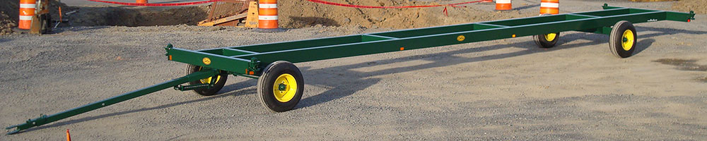 This customer was a warehousing company looking for mobile storage solutions. They required standard flatbeds with pipe pockets to act as a guardrail around the sides of the wagon bed to keep material from rolling off. They also specified safety red tongues on their units to meet union safety requirements at their location. Standard duty 8 Ton running gears were used as the rolling chassis on their mobile material handling platforms.